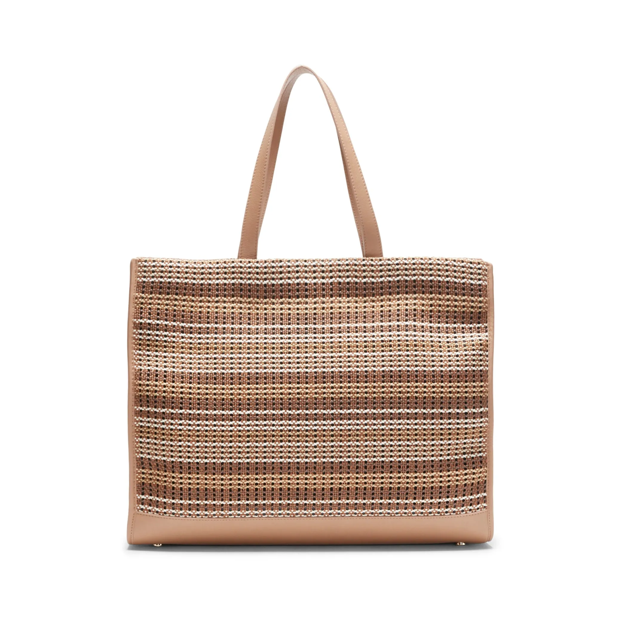 Maxi shopper bag made of soft smooth leather. The front face is made of woven raffia fabric with a leather Fratelli Rossetti logo label. Refined and spacious, it features convenient internal pockets. Snap button closure, H 35 x L 48 x W 12 cm