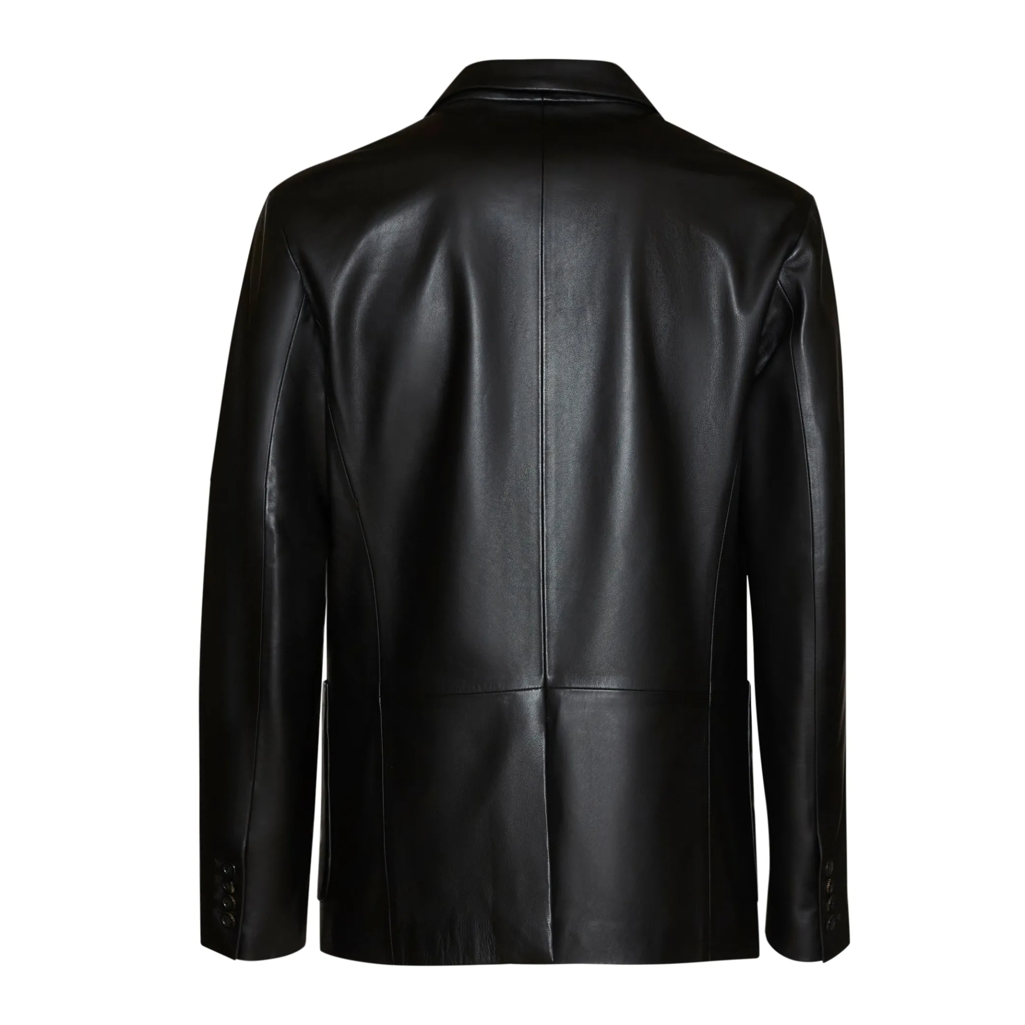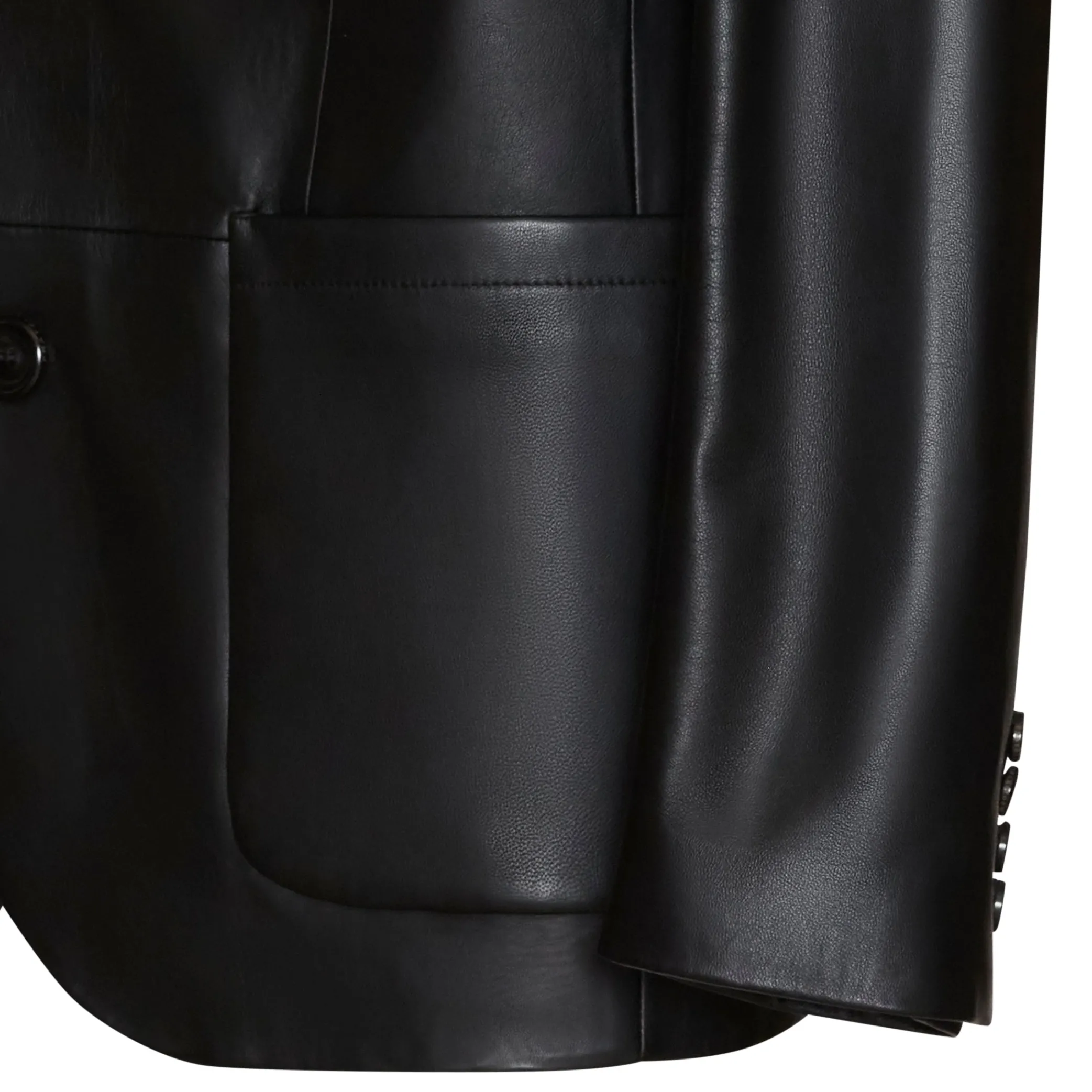 Single-breasted blazer made of soft nappa leather. Semi-unlined garment; closure featuring two horn buttons with a laser-etched logo; chest pocket and side pockets with flap.