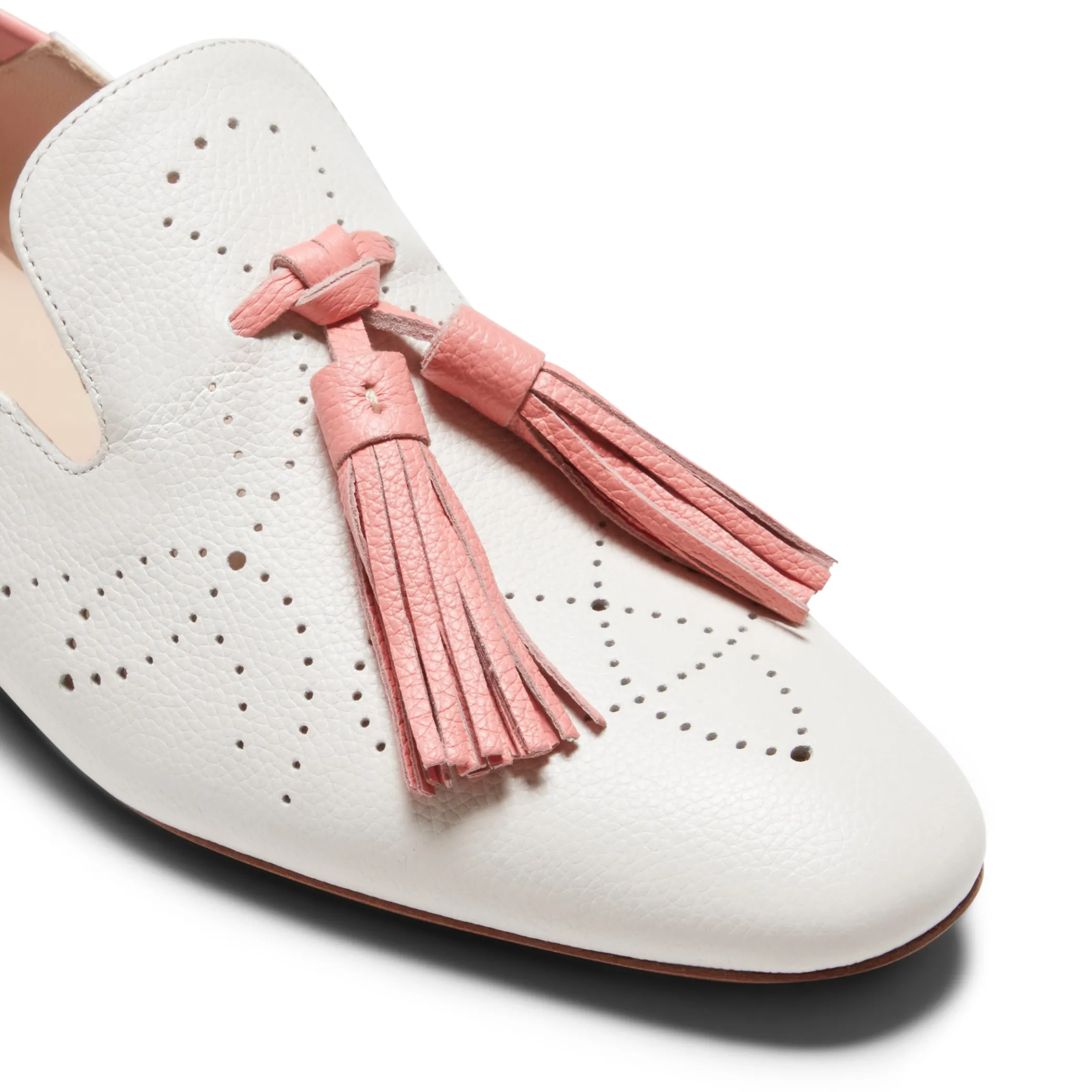 Hobo slipper decorated with a hole pattern, made of soft tumbled calfskin. Characterized by oversized tassels and a contrasting color heel. Leather sole.