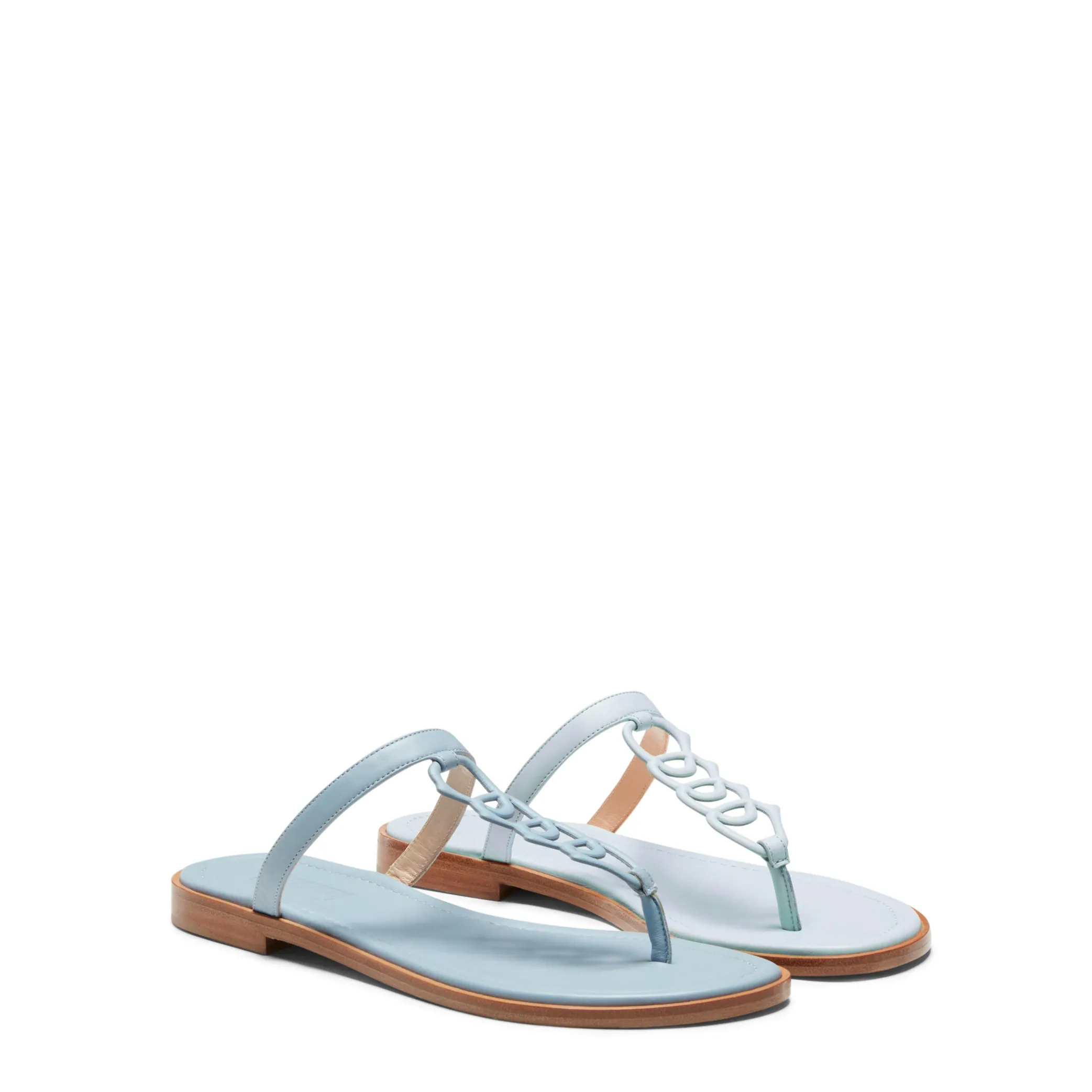 Flat thong sandal from the Magenta line made of smooth leather with a semi-gloss effect. The central string is made up of a small chain with accessories that evoke the shape of the stirrup of the iconic boot. Leather sole.