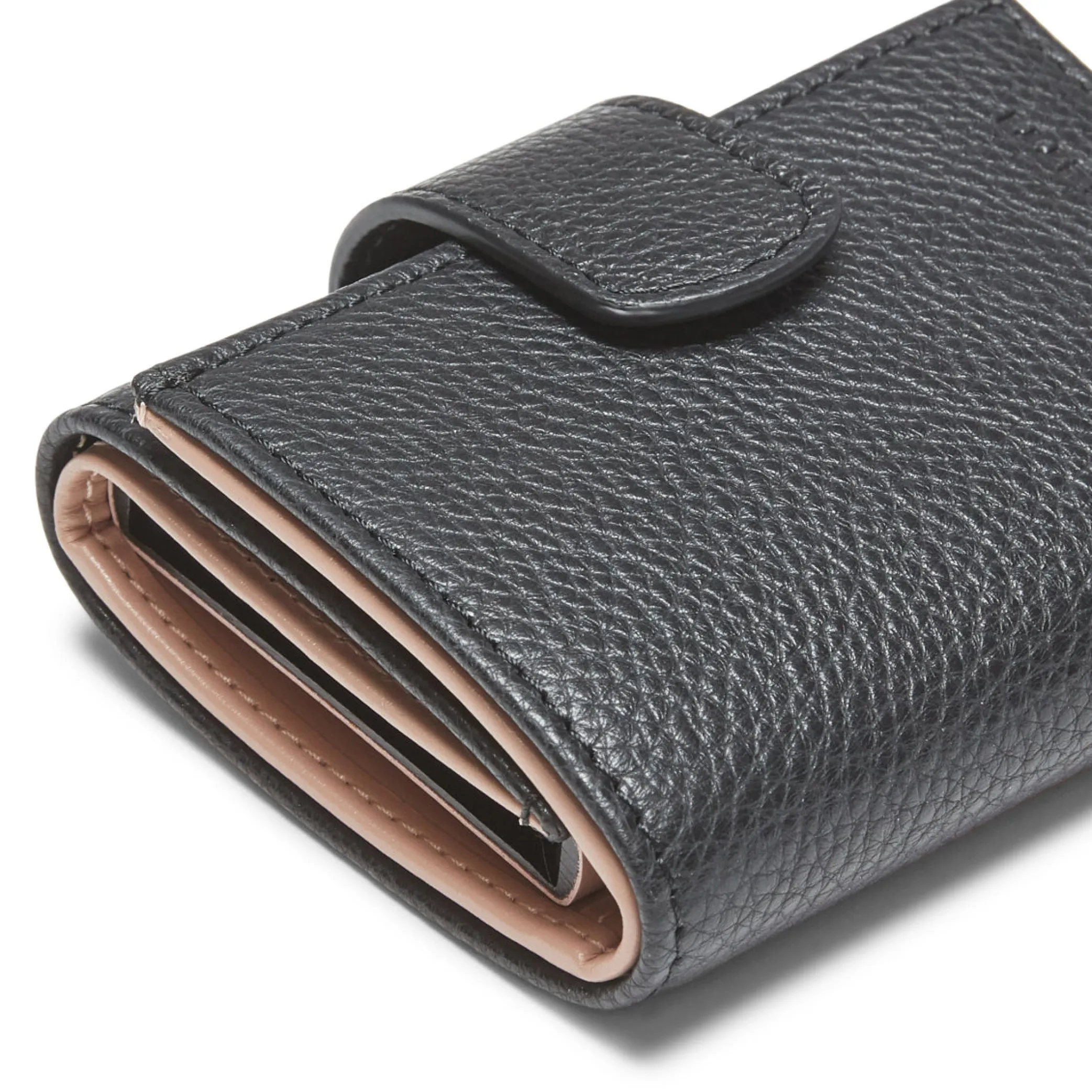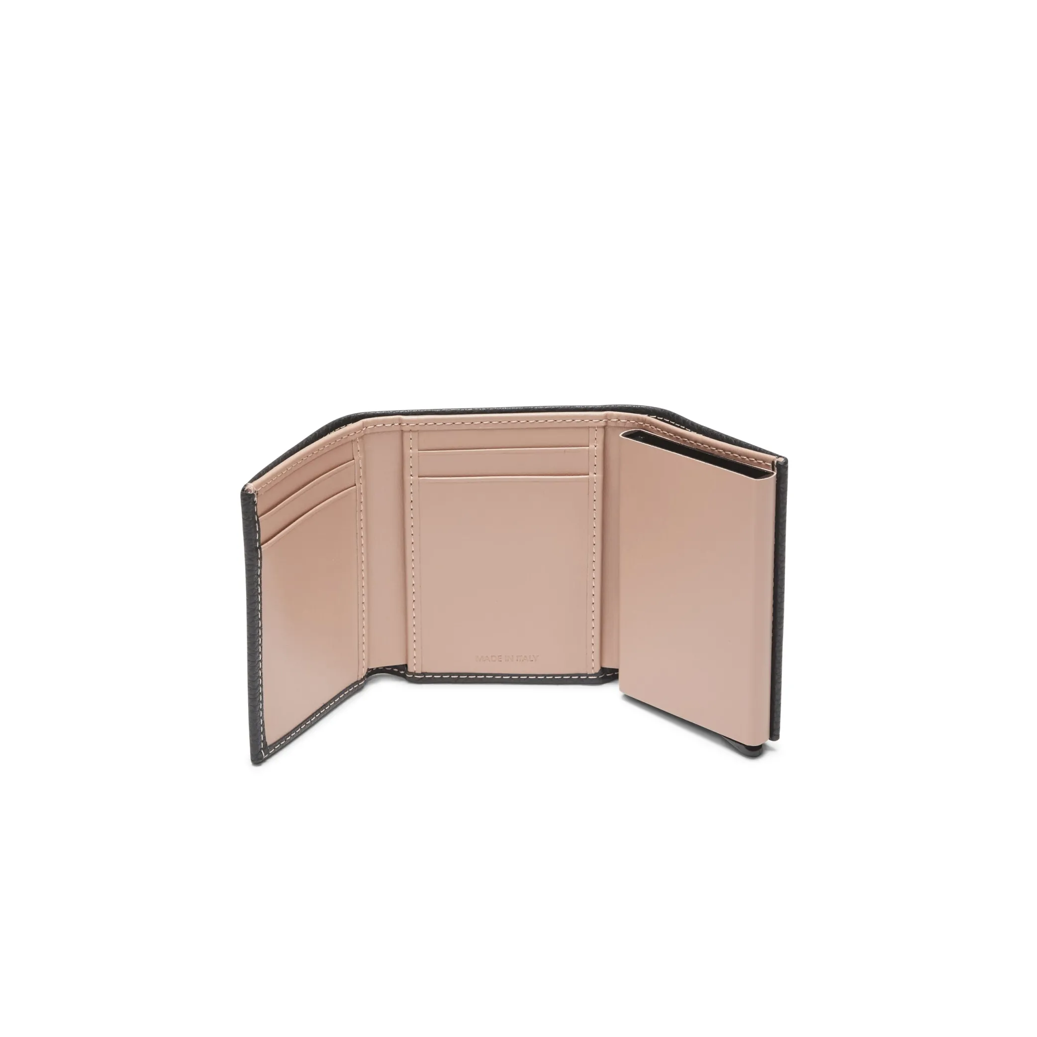 Small wallets made of printed leather. The small dimensions allow it to be conveniently carried in a handbag. The inside has a compartment for banknotes, four slots for cards and two extra pockets. The particular rigid compartment can conveniently contain a number of cards. Fastening with snap button. L8.5xH10