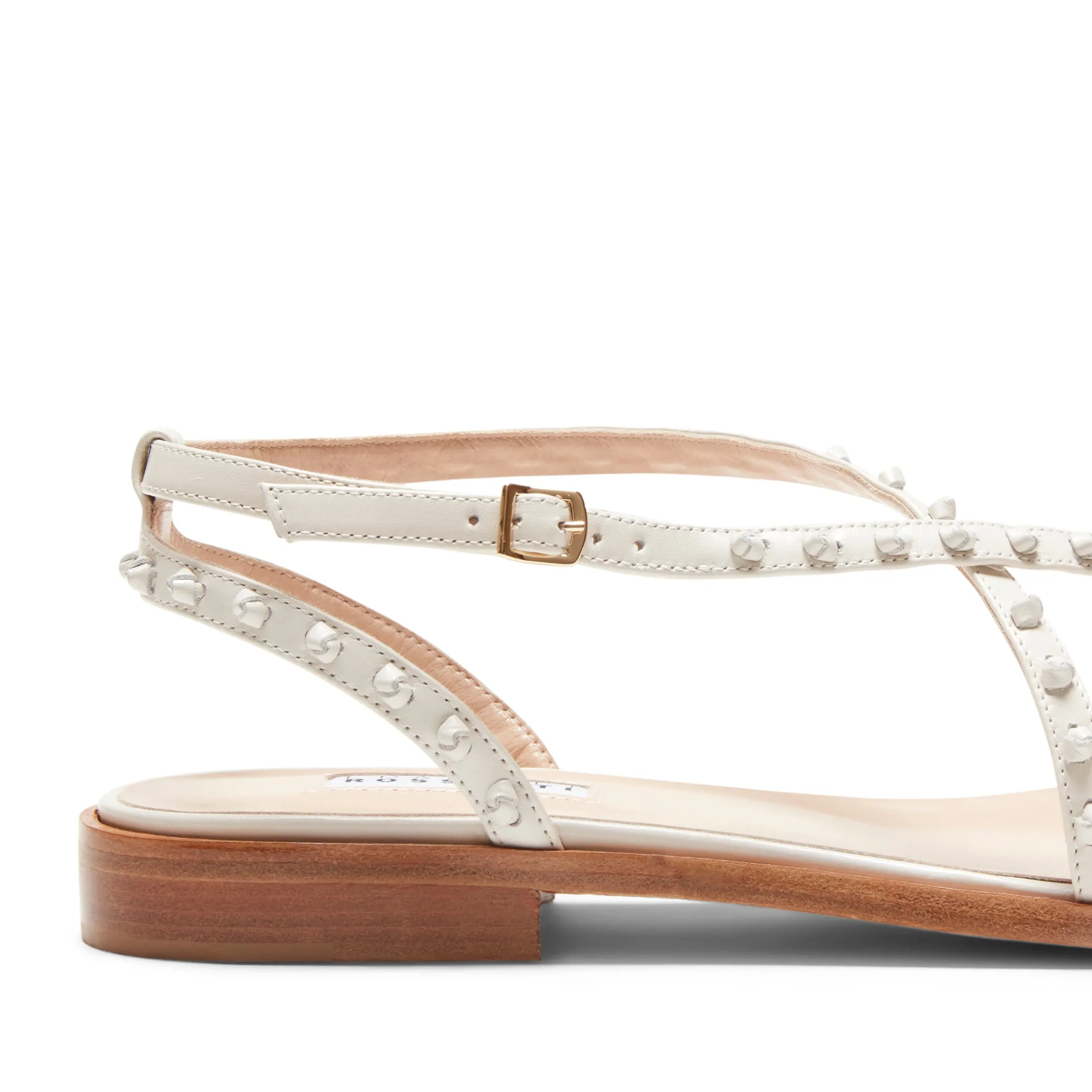 Sophisticated flat leather thong sandal. Characterized by straps finished with small leather knots that wrap the foot and slim the silhouette. Leather sole.