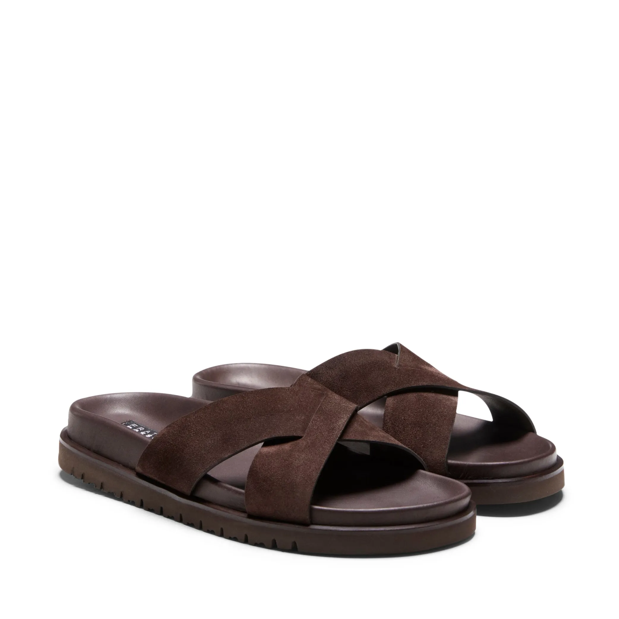 Slide sandal with a casual look, made of soft suede. Featuring criss-crossed bands. Comfortable anatomical rubber sole in the same colour as the upper.