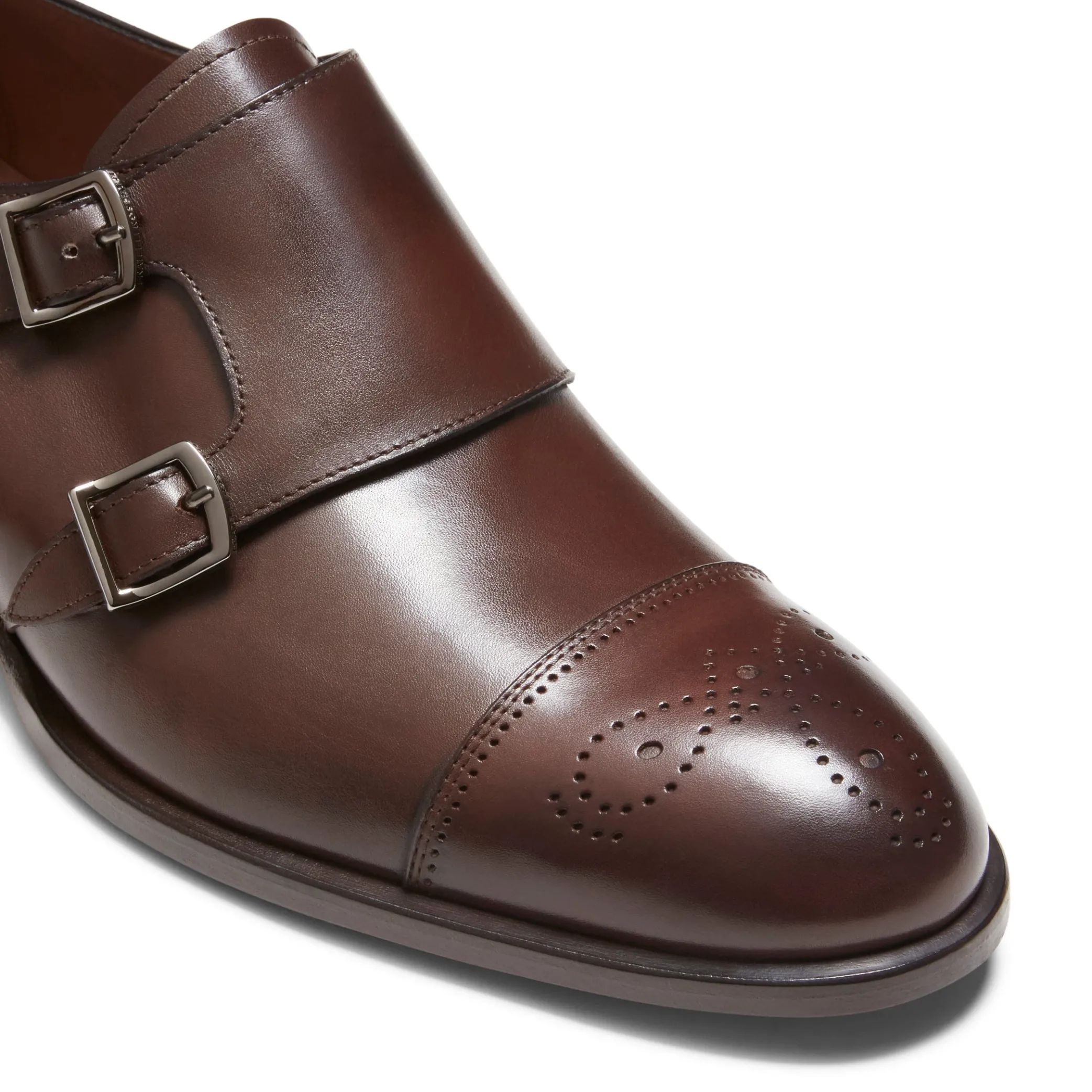 Double-buckle derby shoe made of soft smooth leather with perforations on the toe. The unique workmanship gives the shoe a gradient appearance, accentuated in particular on the toe and spur. Leather sole.
